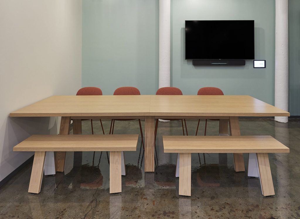 - Accompanying benches manufactured in ash and walnut wood species and feature metal accent detail on leg interior.
