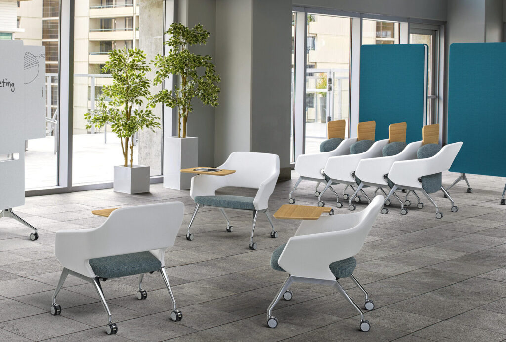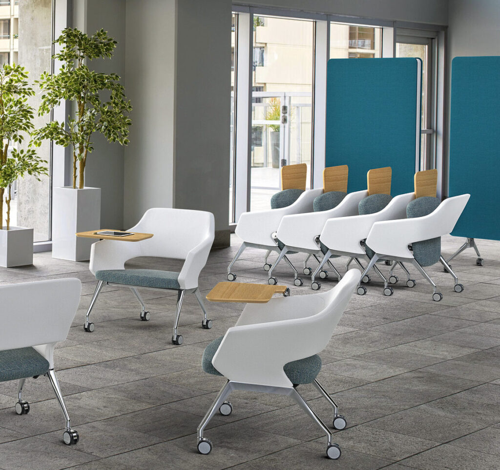 Playing into the informal meeting styles of the workplace today, Flirt Lounge offers a more casual sit with the added benefit of nesting for space-saving requirements. The soft edges along the back and the lower splayed open arms encourage sitting in multiple positions while the interplay of the high-profile cast aluminum legs and the generous, open formed upholstery gives the collection its unique appearance. Offered in two back heights, various base configurations, and with optional flip-up tablet, Flirt maintains its charming personality throughout to easily earn its beloved status.