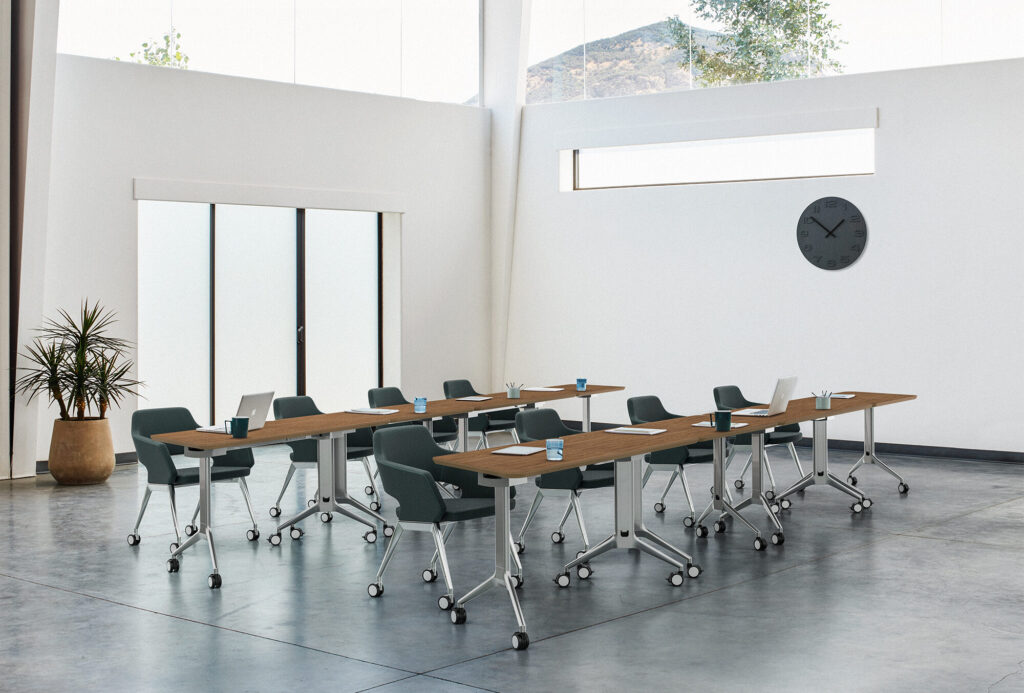 Multipurpose tables flip-up and nest for quick and easy transitions from room to room, or from one set-up to another. With its mix of table shapes, sizes, heights, edge details, integrated wire management and more, the sky’s the limit for this ultimate meeting resource. Complementary pieces include presentation tools that also double as dividers for added privacy or delineating space, while fixed base tables serve a bevy of more traditional meeting requirements. All in all, Flirt provides the opportunity to create engaging environments, strengthen interactions and become the creative destination coveted by all.